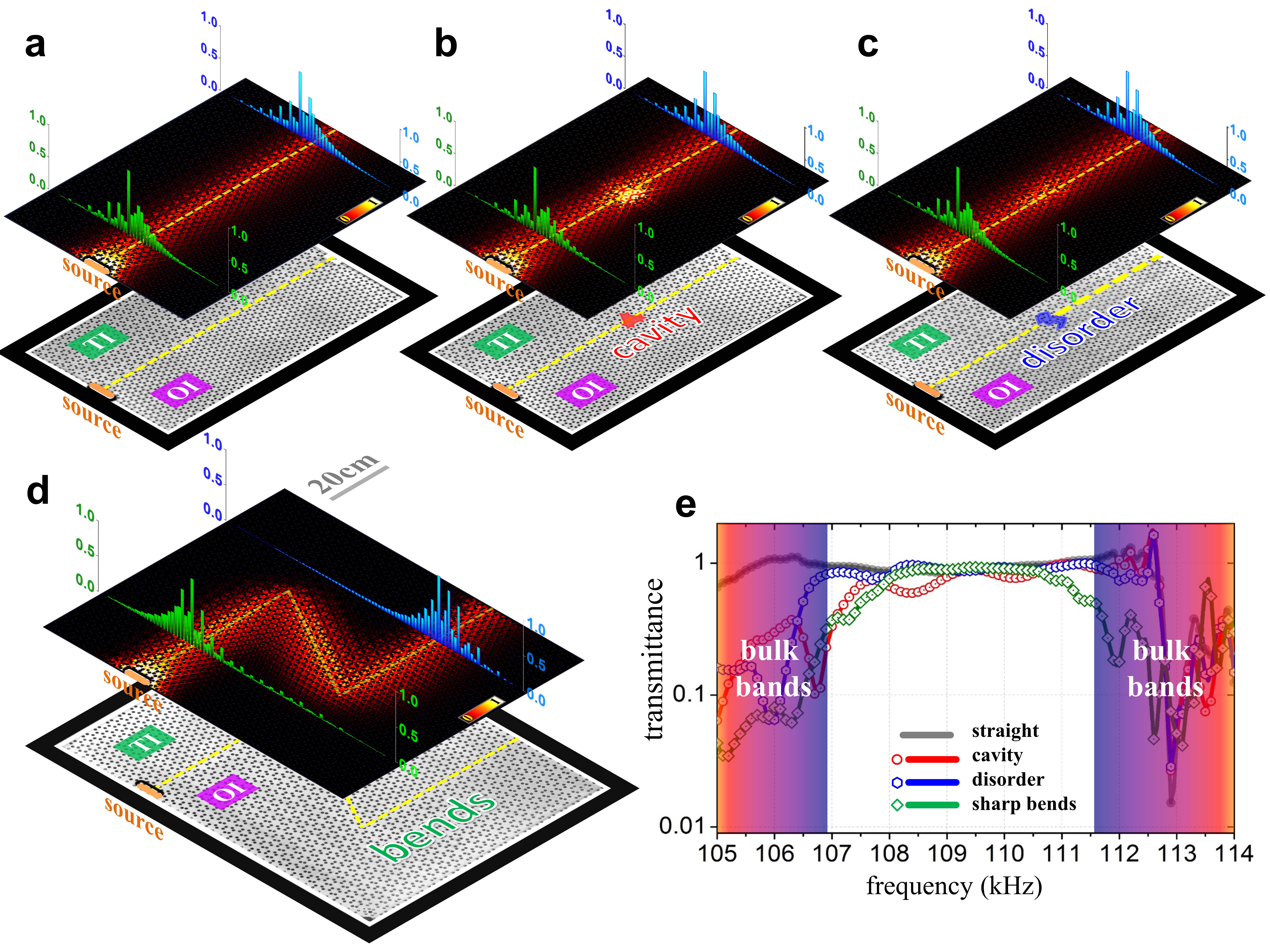 图4,对缺陷及各类转角均免疫的固体声波传输线(波导):a波导中未放置任何缺陷;b波导中放置一个由15个孔洞缺失构成的“空位”缺陷;c波导中放置一个由15个孔洞随意排布构成的“位错”缺陷;d具有120°大转角的Z型波导;e上述四种波导中固体声波的透过率。数值和实验的结果均表明:固体声波在拓扑边界上的传输没有发生任何背散射,实现了一个传输自由度极高、缺陷免疫、损耗极低且具有较宽工作频段的“完美”固体声波导。