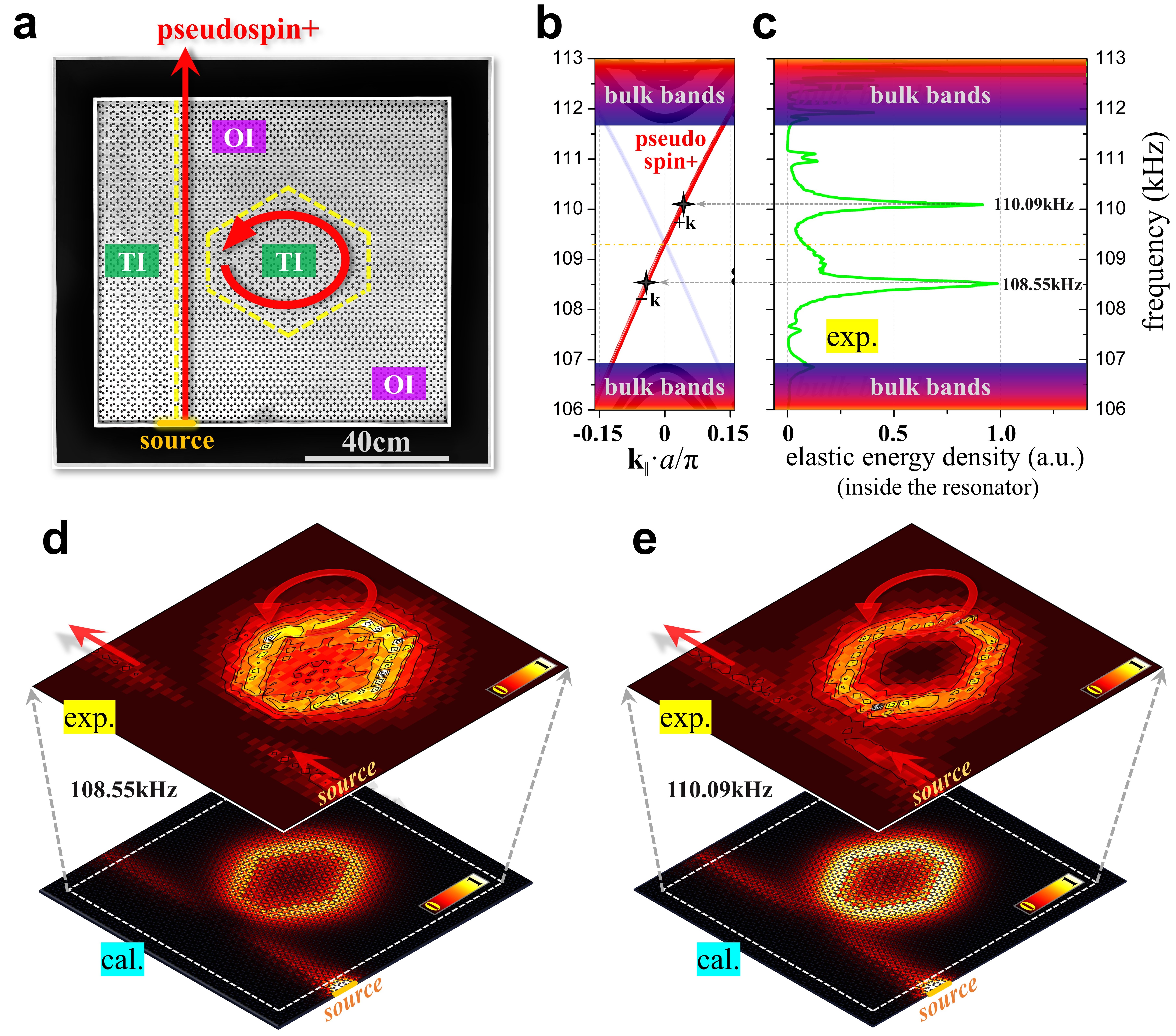 图5,由该固体声波导构建的环形谐振器:a实验样品由(左侧)一根直波导和(右侧)一根闭合六边形波导(环形谐振腔)构成;b固体声波在左侧直波导下端被激发并向上传输,整个系统中仅存在对应于一种“赝自旋”态的传输模式;c实验测量的环形谐振腔中能量频谱,观测到两个的谐振峰(103<品质因子Q<104),谐振频率关于边界态的狄拉克点呈对称分布;d和e在这两个谐振频率下,样品中的固体声场分布及能流情况。