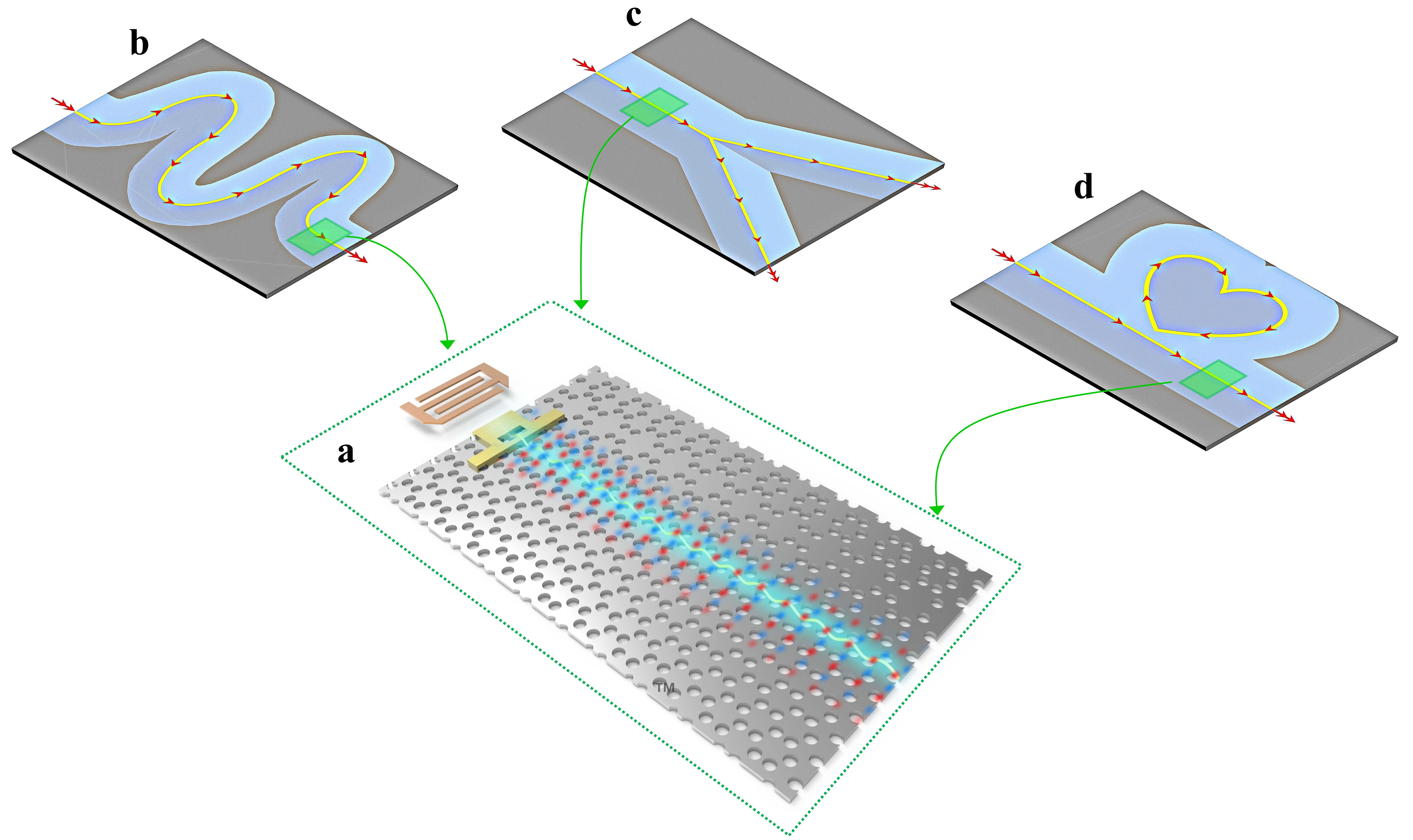 图1, 利用弹性波量子自旋霍尔效应实现的具有拓扑保护的固体声学传输线:(a)其具有极低的传输损耗,并完全兼容于各工作频段及各类材料。利用该传输线可以构建片上集成声学的基础元件,例如:具有任意路径及形状的(b)固体声声波导、(c)固体声分路器及(d)具有高品质因子的固体声谐振腔等。