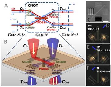 图一、(A)传统偏振编码的控制非门的设计;(B)使用介质加载表面等离激元波导的工作原理;(C)偏振依赖分束器的SEM图;(D)从右耦入端入射的TM模式的传播效果;(E)从左耦入端入射的TM模式的传播效果;(F)从左耦入端入射的TE模式的传播效果。蓝色箭头表明耦入光位置和偏振方向。