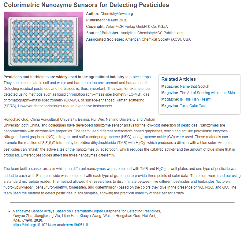 近日,太阳成集团122ccvip魏辉教授课题组与中国农业大学郭红超教授团队合作,利用石墨烯基纳米酶构建传感器阵列,用于芳香类农药的检测。该成果以“Nanozyme Sensor Arrays Based on Heteroatom-Doped Graphene for Detecting Pesticides”为题,于近期发表于Analytical Chemistry杂志上(https://doi.org/10.1021/acs.analchem.9b05110)。论文发表后被Chemistryviews.org网站以 “Colorimetric Nanozyme Sensors for Detecting Pesticides” 为题进行了报道(图1)。