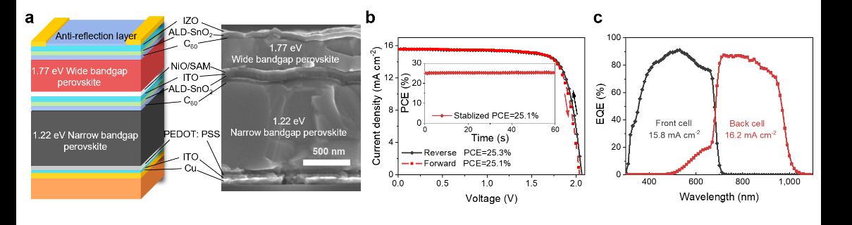 结合宽带隙钙钛矿的优化,团队首次在衬底型全钙钛矿叠层器件中实现了超过25%的转换效率(图3b),为该结构器件目前报道的最高值。