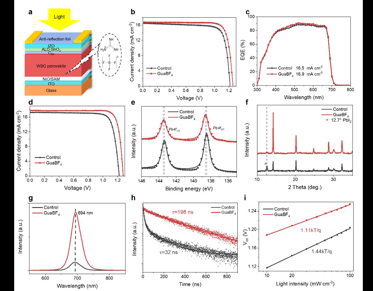 研究团队通过使用四氟硼酸胍(GuaBF4)作为添加剂,有效地提升了宽带隙钙钛矿器件的性能。在具有半透明结构的宽带隙单节(图2a)电池中,实现了16.7%的能量转化效率,高于对照器件的15.3%(图2b)。EQE中反应的短路电流与J-V一致,也得到了提升(图2c)。同时,非半透明的宽带隙单节电池取得了19.1%的能量转化效率,是目前报道的1.77 eV带隙的该结构器件最优性能之一。DFT计算表明,Gua+的引入抑制了卤素空位的产生,同时相较于常用于钝化缺陷的PEA+,PA+等分子,带来更小的晶格畸变。BF4-与Pb之间形成的较强氢键也实现了对卤素空位的钝化效果。XPS(图2e)显示,GuaBF4的加入增加了钙钛矿中与铅的结合能。XRD(图2f)显示,含GuaBF4添加剂的钙钛矿薄膜具有抑制了钙钛矿的降解,降低了碘化铅含量,具有更优的结晶型。稳态和瞬态PL(图2g, h)显示,含GuaBF4添加剂的钙钛矿薄膜具有更强的光致发光特性和更长的载流子寿命,代表了钙钛矿薄膜内降低的缺陷密度。理想因子(图2i)的测量表明,含GuaBF4添加剂的钙钛矿器件具有较低的理想因子,对应了器件获得的较高的填充因子。
