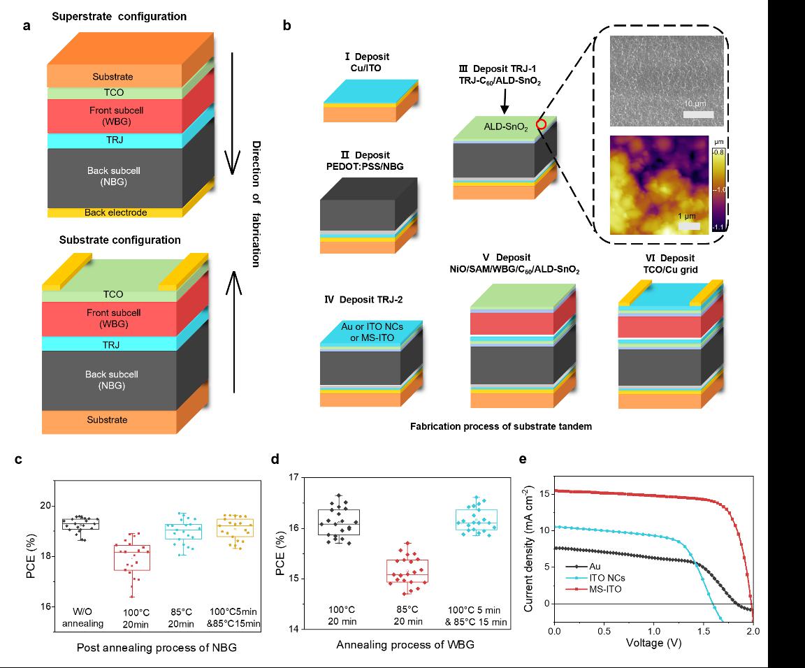 图1 “衬底型”全钙钛矿叠层器件。a, 顶衬型和衬底型的全钙钛矿叠层器件结构示意图。 b, 衬底型全钙钛矿叠层器件的制备过程。 c, 窄带隙钙钛矿器件进行后退火的性能变化。 d, 不同退火温度下宽带隙钙钛矿器件性能变化。 e, 采用不同隧穿复合结的衬底型全钙钛矿叠层器件的J-V曲线。