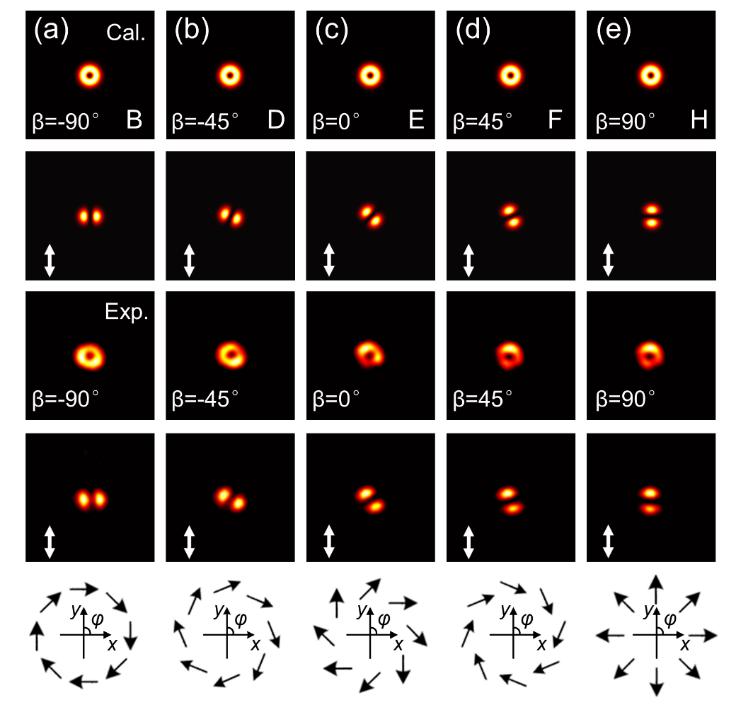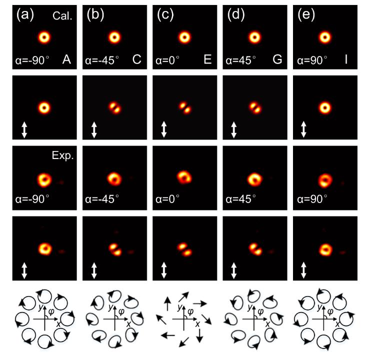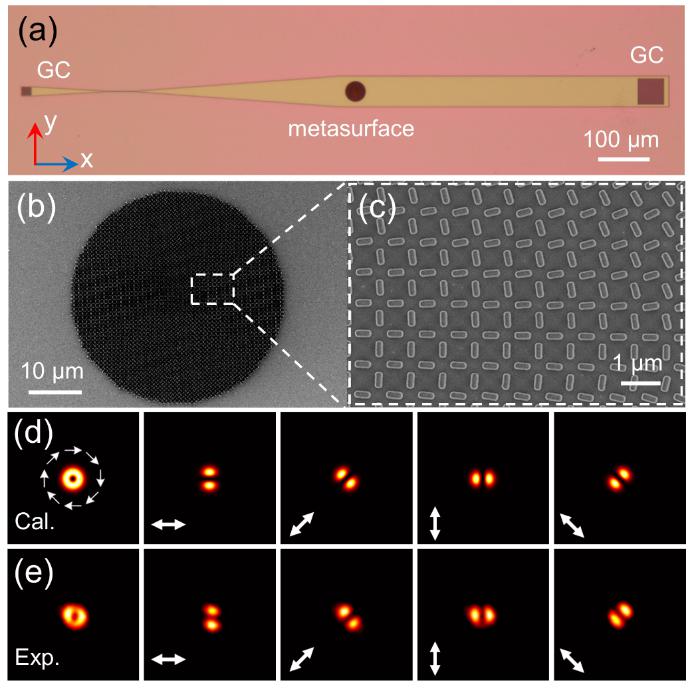 图2. 片上产生庞加莱光束。(a-c)超构表面集成铌酸锂光波导结构,(d-e)生成的柱矢量偏振光束。