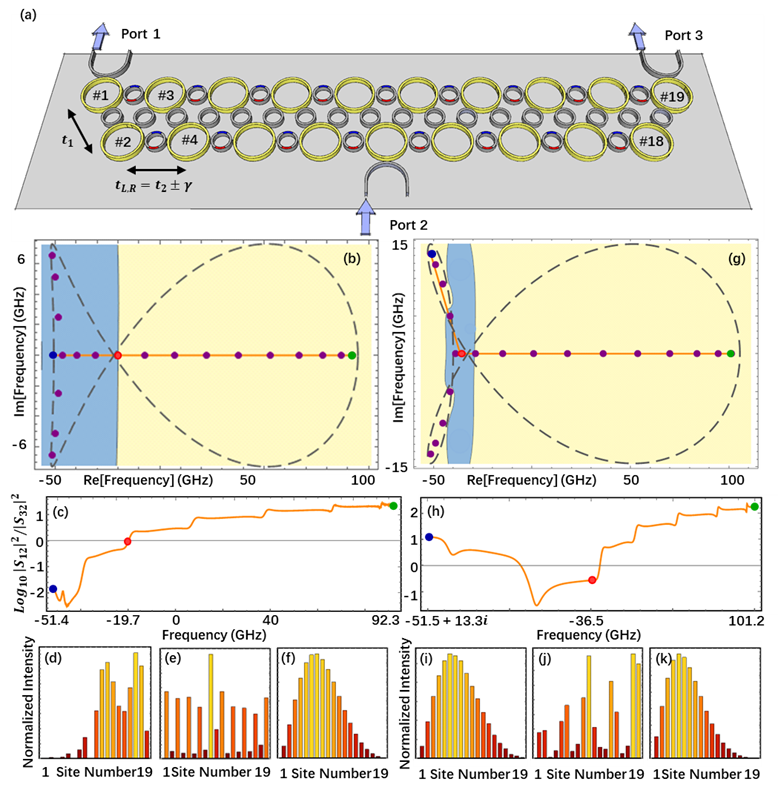 为了研究该理论发现,研究人员他们构建了硅波导谐振环阵列,通过特定排布方式可以实现谐振环间的等效次近邻耦合。利用带有折射率虚部调制的反共振辅助耦合环为谐振环阵列引入了非对称次近邻耦合(即非厄米性),可以在光学体系展示上述单原子链模型。通过传输矩阵理论可以验证此种非对称耦合实现的可行性,并且进一步给出折射率虚部与非对称耦合参数的具体关系。