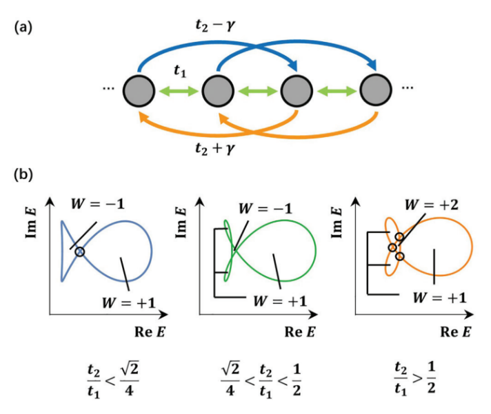 本研究从理论上分析了具有非对称次近邻跃迁项的一维单原子链哈密顿量,考察其周期性边界条件下能谱的拓扑特性。借助自相交点与卷绕数的概念,可以证明此系统能谱随耦合参数的变化划分为三个相,对应三种不同的非厄米趋肤效应。研究人员详细推导了三种非厄米趋肤效应相的相变边界,并证明前人在此模型上实现的双极趋肤效应属于其中一种。研究表明介于平凡趋肤效应与双极趋肤效应间还存在另一种特殊的非厄米趋肤效应,被称为V型趋肤效应,其趋肤态堆积方向随能量增大反转两次。