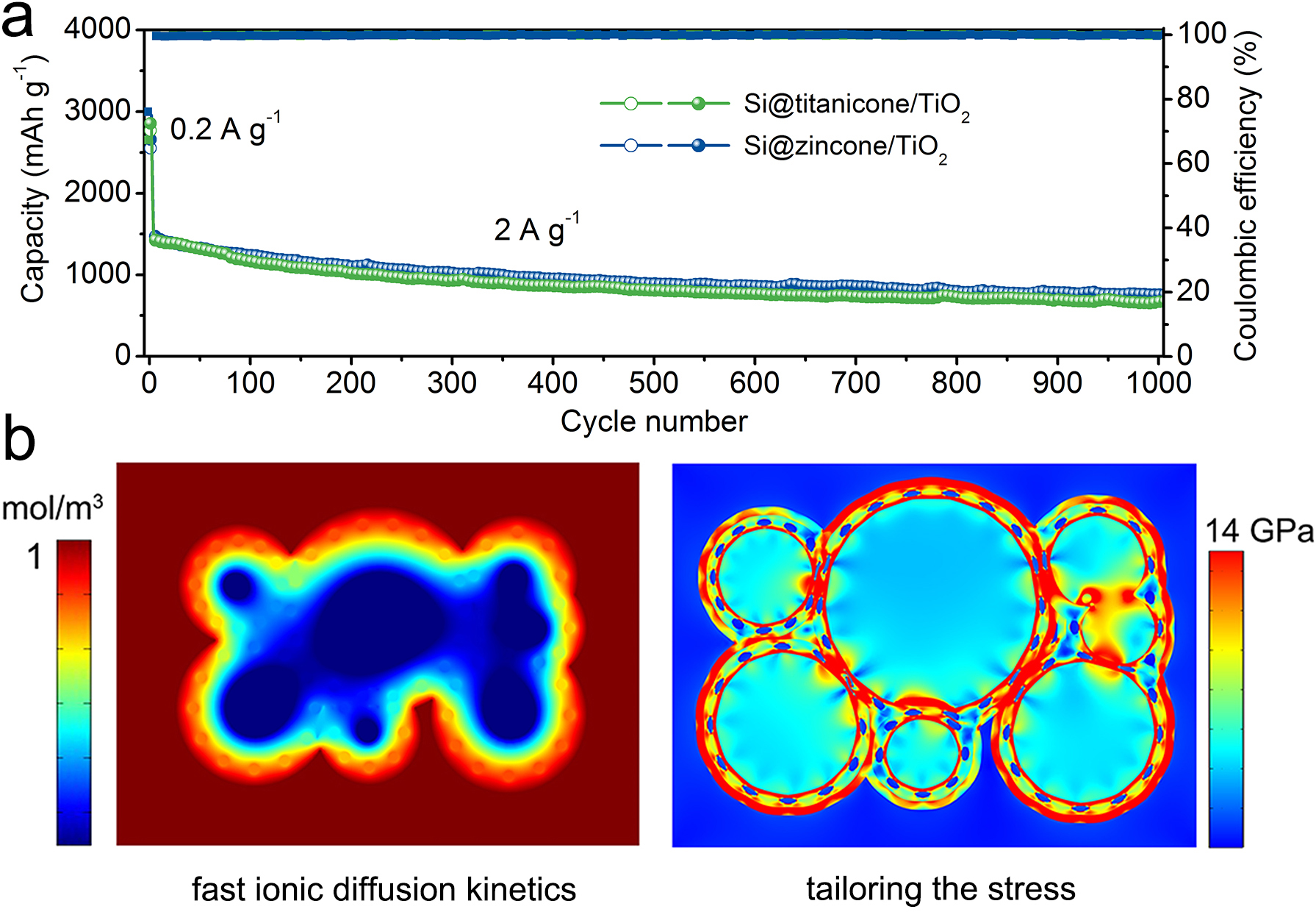 图2. Si@zincone/TiO2的循环性能及有限元仿真结果