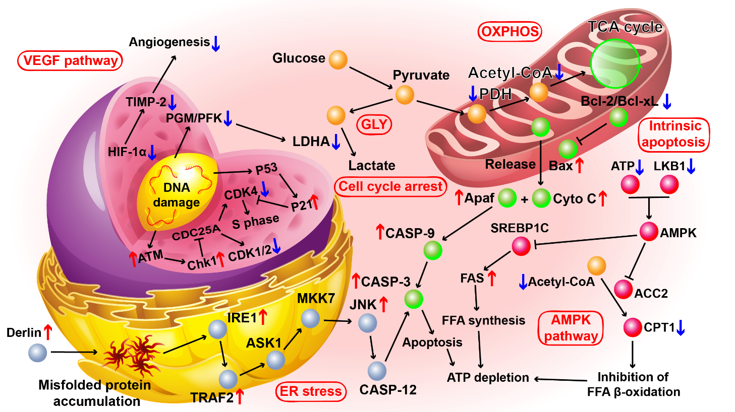我们进一步探究了上述“自淬灭”机制的实际应用效果和相关的分子生物学机制。Seahorse XF线粒体功能分析结果表明我们所设计的材料可以迅速耗竭癌细胞内的ATP贮存,并藉此诱导细胞程序性死亡。基于对于基因组学和蛋白质组学数据的生信挖掘,我们证实联合治疗骗过了癌细胞内的能量感受器,同时通过诱导内质网应急和DNA损伤修复等方式进一步加速了细胞的ATP耗竭 (图二)。以一线晚期肝癌靶向药物索拉菲尼为对照,我们证实本课题中所设计的“自淬灭”治疗显著破坏肝转移灶的同时保全了肝功能,最终获得了两倍于化疗的生存收益。基于我们所设计治疗方案不依赖于细胞标志物起效的特点,我们相信该体系未来也有望在肝脏以外的器官癌转移治疗中发挥关键作用。