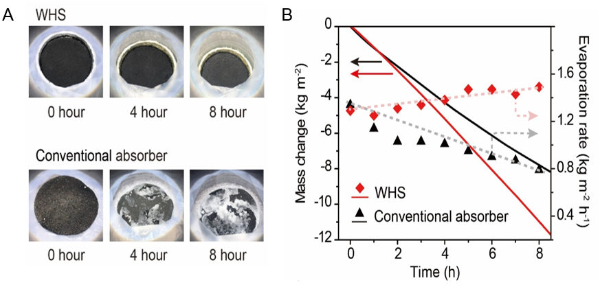 图2 .WHS器件和传统吸收体在处理盐水(起始浓度为10 wt%)的表面光学照片A) 及水蒸发性能曲线B)。