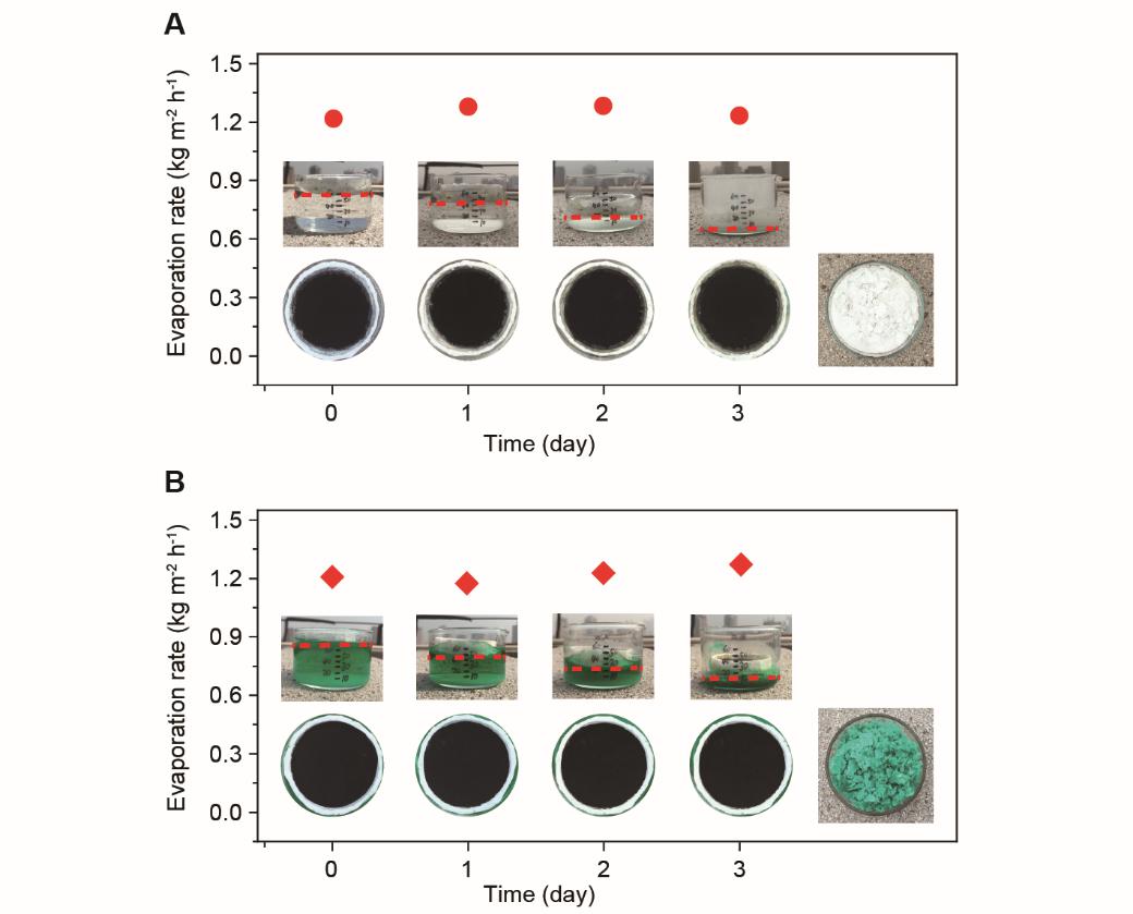 WHS器件在处理盐水或者污水时,能实现固液体的完全分离。如图3A和3B所示,当WHS器件漂浮在盐水(污水)表面时,随着水逐渐蒸发,WHS器件逐步下移,直至将水完全蒸发留下盐或者溶质。值得一提的是,在此过程中,WHS器件表现出持续稳定的水蒸发效率,且表面并未有污染(盐或溶质的析出)。此过程中WHS器件表面照片展示在图3A和3B中的第二列插图处。当水完全蒸发后,留下的盐或溶质可以很容易被取出,如图3A和3B的右下角插图所示。