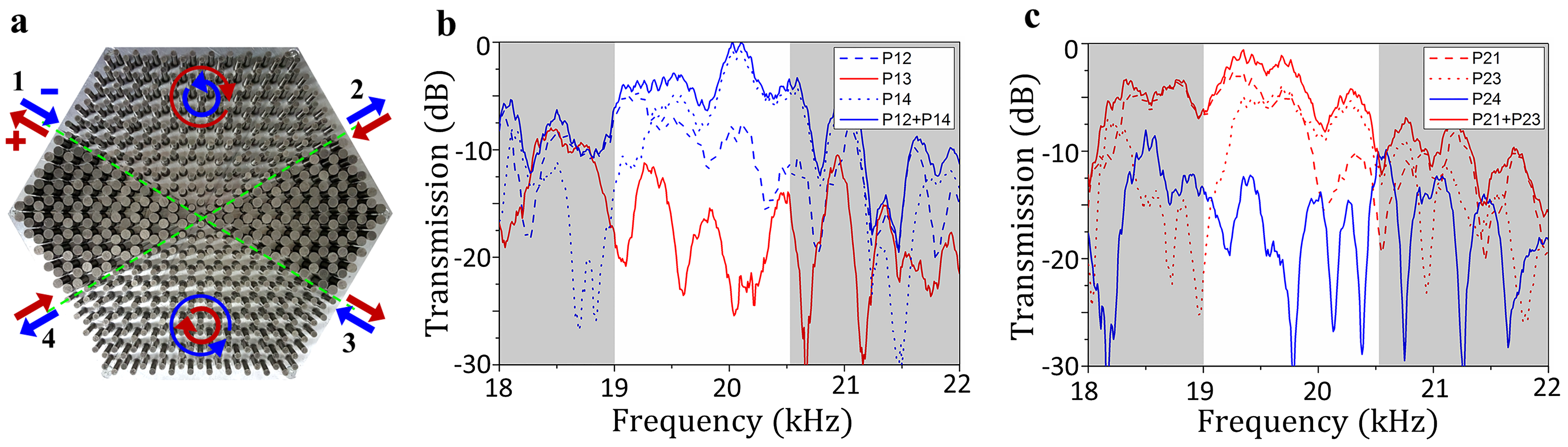 图-3 (a)声自旋量子霍尔效应样品照片。(b)声赝自旋-透射谱。(c)声赝自旋+透射谱。