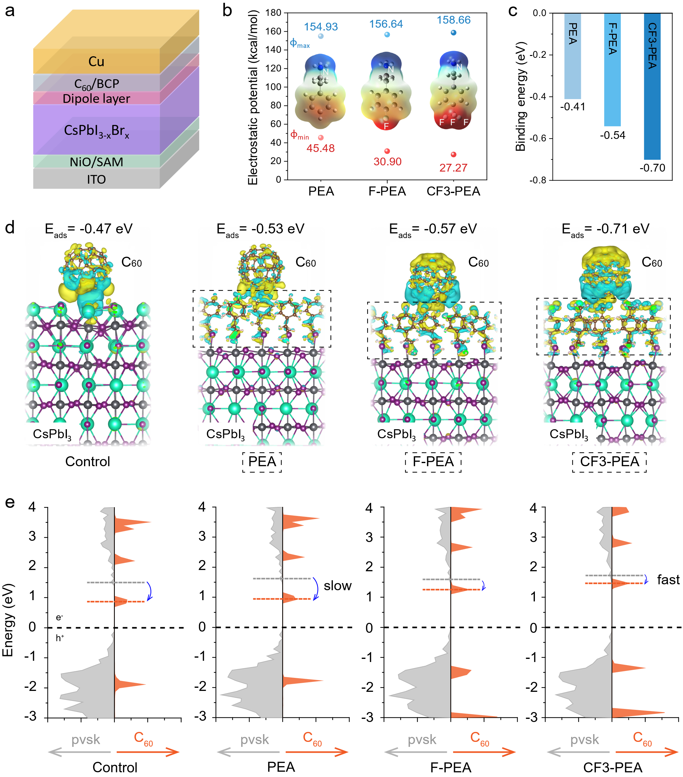 为解决上述瓶颈,太阳成集团122ccvip谭海仁教授团队和多伦多大学Edward H. Sargent教授团队合作,通过第一性原理计算进行分子结构设计,在钙钛矿常用钝化剂苯乙铵阳离子(PEA)的基础上,在氨基对位引入氟官能团(F)和三氟甲基官能团(CF3)形成极性递增的对氟苯乙铵阳离子(F-PEA)和对三氟甲基苯乙铵阳离子(CF3-PEA)钝化剂,用于全无机钙钛矿和C60界面(图1)。通过第一性原理计算研究发现,氨基端的静电势最大值为φmax,PEA<φmax,F-PEA<φmax,CF3-PEA,使得CF3-PEA与钙钛矿表面Cs空位的结合力最强,可有效抑制钙钛矿薄膜缺陷。氨基对位的静电势最小值为φmin,PEA>φmin,F-PEA>φmin,CF3-PEA,且随分子极性增大C60在钙钛矿表面吸附能递增,界面接触质量得以提高。另外,偶极层诱导钙钛矿/C60异质结的电荷再分配,PEA钝化抑制电荷向C60的集聚,而在F-PEA和CF3-PEA钝化钙钛矿的情况下得到促进。通过电子结构计算,我们提出了偶极层对无机钙钛矿吸光层的功函数和带边能级位置进行调控从而加速界面电荷提取的规律。DFT的结果表明,相比于PEA和F-PEA,CF3-PEA偶极层对反式全无机钙钛矿的缺陷钝化和界面电荷提取的作用更加有效。