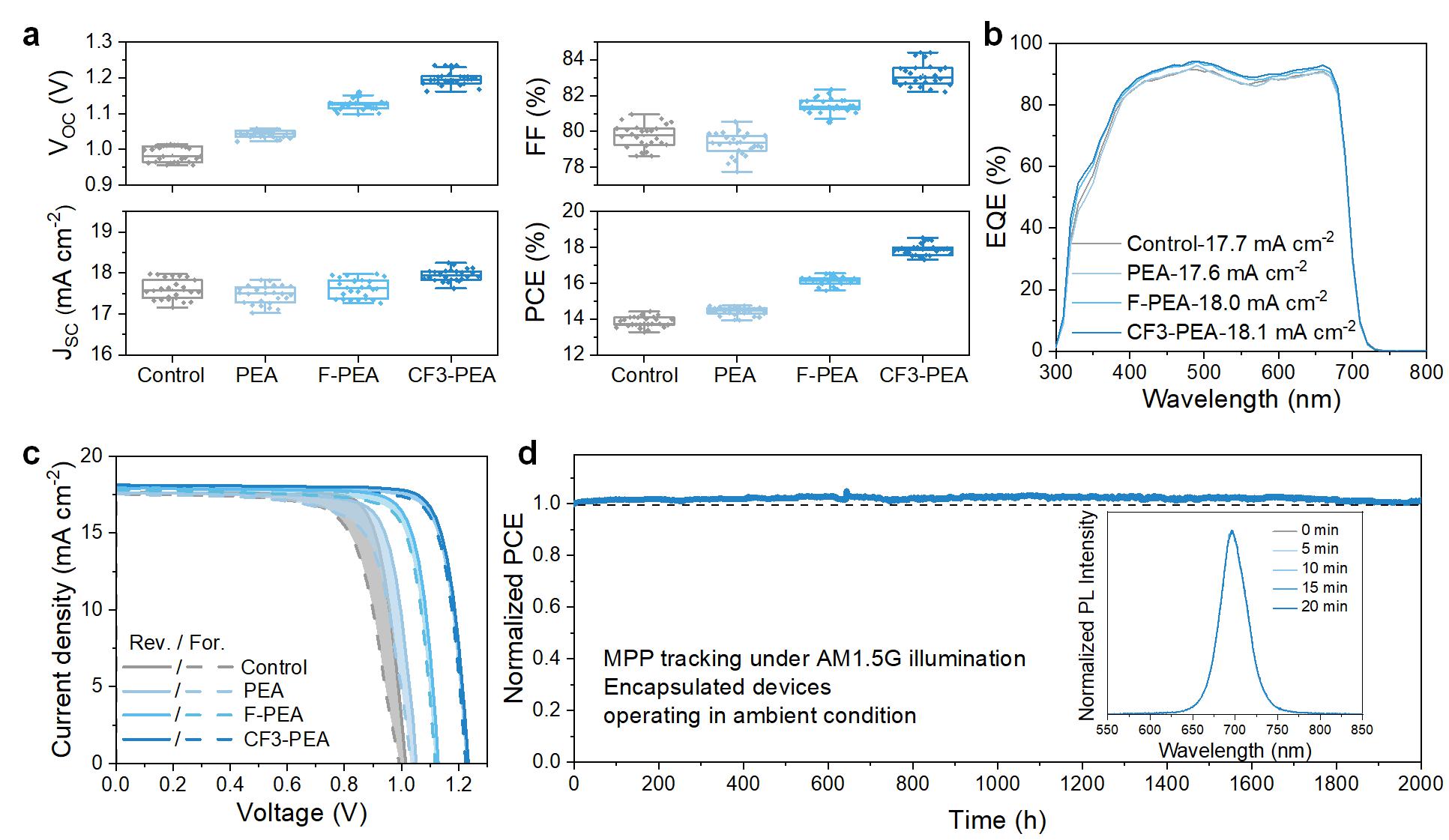 通过实验表征分析,研究团队发现钝化分子处理后并未对钙钛矿薄膜的形貌和晶体结构产生影响,也没有二维钙钛矿生成,钝化分子独立存在于全无机钙钛矿表面。测试发现CF3-PEA偶极层修饰将钙钛矿和C60的能级差从0.74eV降低到0.16eV,极大地改善了界面能级排列。从器件光伏性能上看,常用的PEA钝化仅能轻微改善器件开路电压(VOC),但降低了短路电流密度(JSC)和填充因子(FF),而CF3-PEA全面提高了器件性能参数,最高效率达到18.5%,并极大地改善了器件的回滞现象。全无机钙钛矿电池封装后在MPP下连续运行2000小时并未发生衰减(图2)。