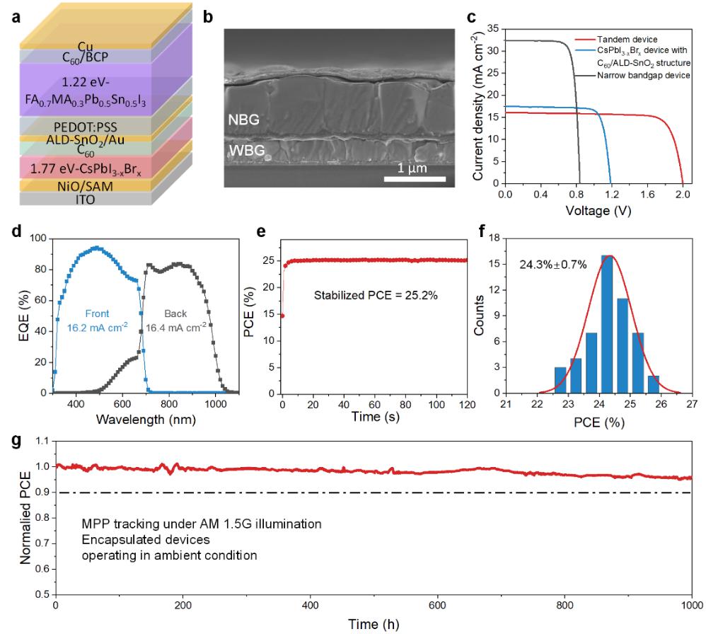 基于此构筑的全钙钛矿叠层电池最高效率实现25.6%,稳态效率为25.2%,并在连续模拟1个太阳照明下,在MPP下追踪超过1000小时后仍可保留初始效率的96%,这是目前全钙钛矿叠层电池的最长寿命记录(图3)。该工作是无机钙钛矿电池在全钙钛矿叠层电池中应用并实现高效率和高稳定性的一次重要突破。