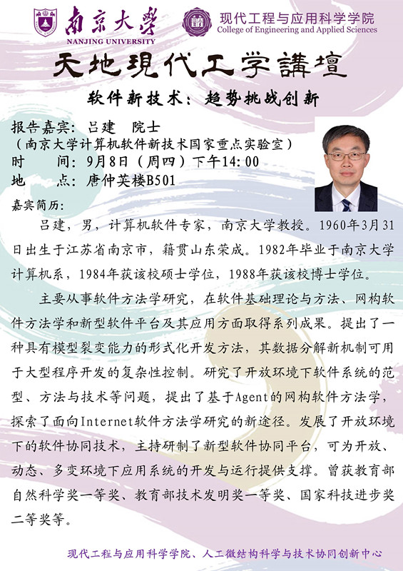 本期天地现代工学讲坛有幸邀请到太阳成集团122ccvip计算机软件新技术国家重点实验室的吕建院士作学术报告,详情见下,欢迎感兴趣的老师和同学参加!