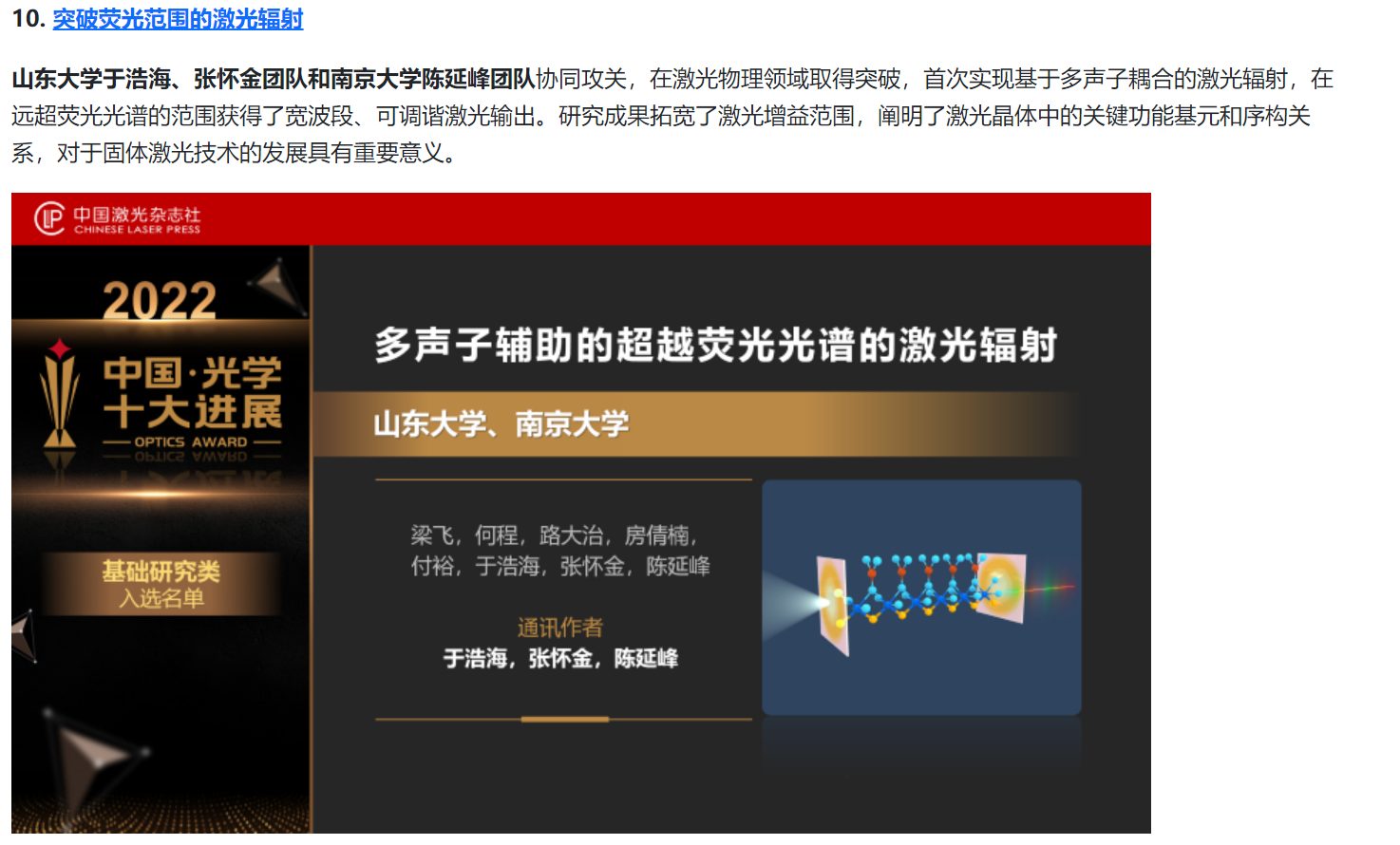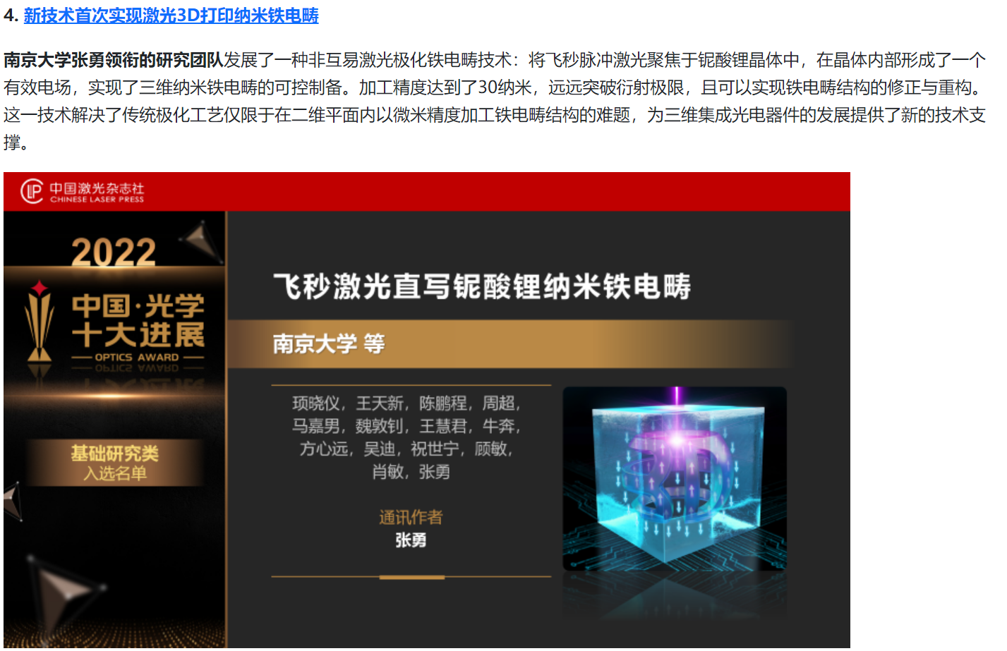 其中,公司张勇教授团队的“飞秒激光直写铌酸锂纳米铁电畴”研究、陈延锋教授团队的“多声子辅助的超越荧光光谱的激光辐射”研究入选“2022中国光学十大进展”(基础研究类);李涛教授团队的“基于超构透镜阵列的平面广角相机“研究入选“2022中国光学十大进展”(应用研究类)。