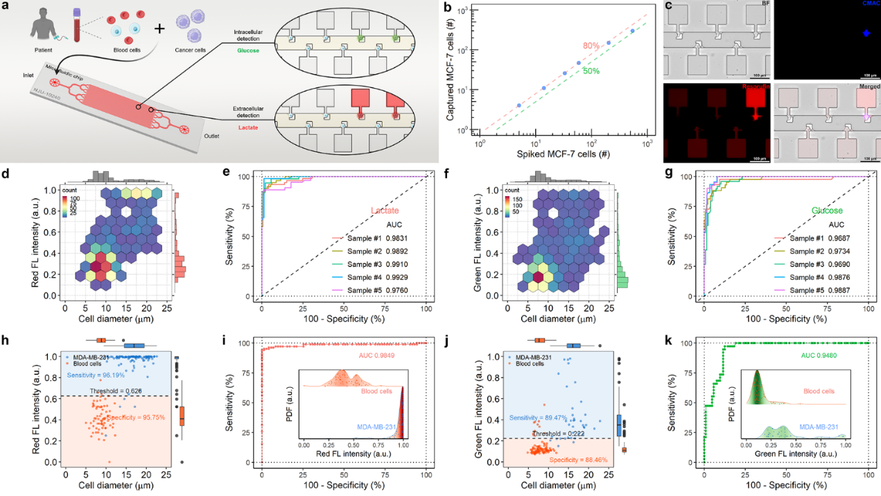 此外,该平台可直接用于捕获分析未经处理的全血样本中的循环肿瘤细胞,肿瘤细胞的捕获率可达80%以上,根据单细胞“糖代谢”特征检测肿瘤细胞的灵敏度高达95%以上,具有较高的临床应用潜力。