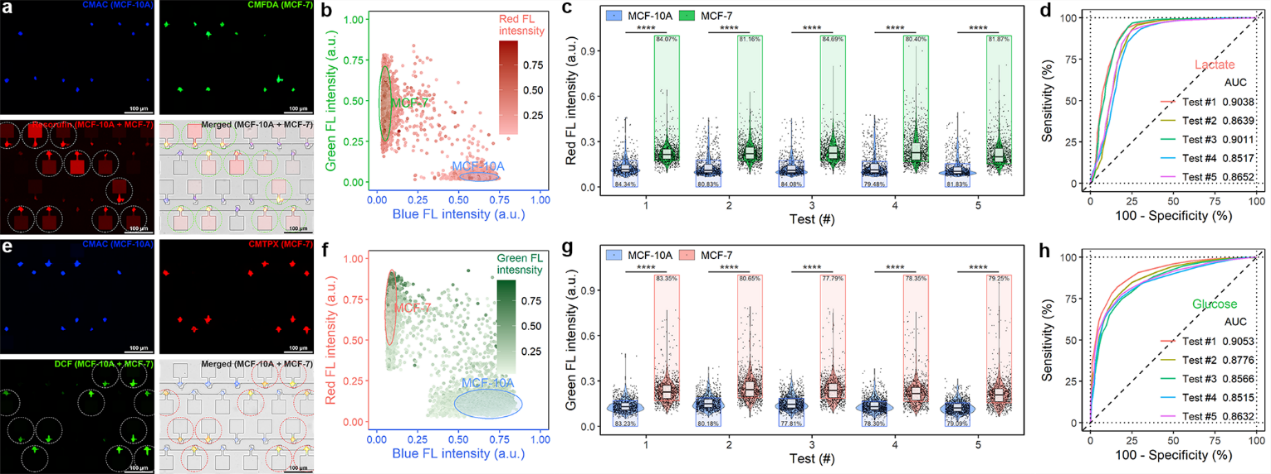 基于该平台,研究团队分析了正常乳腺上皮细胞MCF-10A,弱转移能力的乳腺癌细胞MCF-7,强转移能力的乳腺癌细胞MDA-MB-231,以及乳酸抑制药物处理过的乳腺癌细胞的“糖代谢”特征。芯片上的大规模统计分析结果与小鼠尾静脉转移瘤模型一致,验证了该平台用于癌细胞代谢分析及成瘤能力评估的可行性。