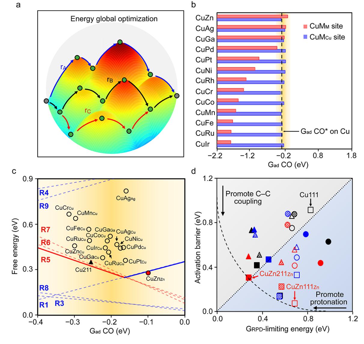 图1. a. 二氧化碳电还原全局能量优化图。b. 铜基二元活性位上CO*吸附能的筛选。c. 二氧化碳电还原到多碳产物的反应相图。d.各反应位点的活化能。