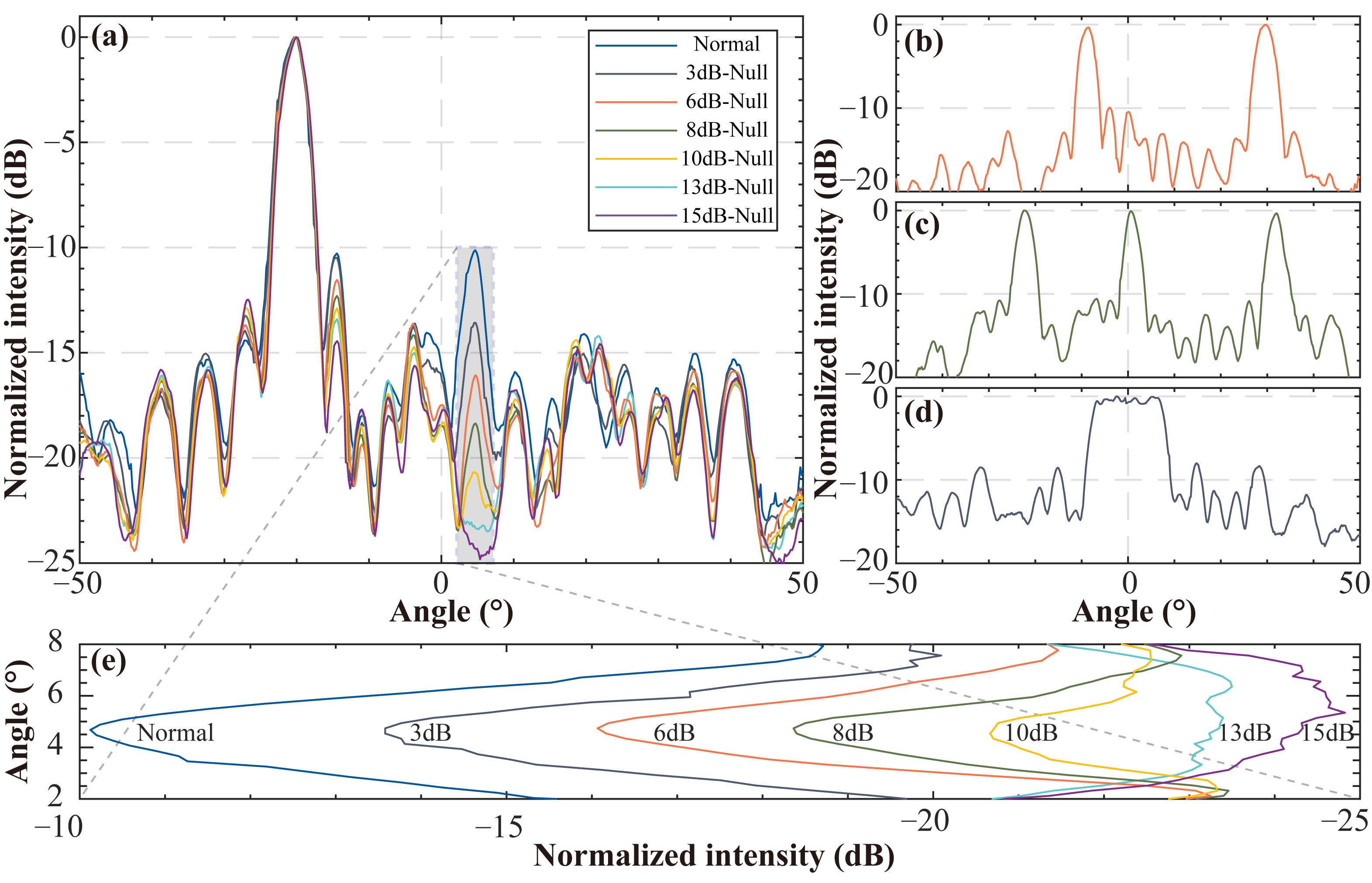 图2. 实验得到APP生成器产生的不同类型远场模式:(a)常规单光束(无限制)和具有定向零点抑制区域的单光束,抑制强度从3dB到15dB(+4°到+6°,标记在浅灰色阴影区域)。在区域内,光强度明显受到抑制;(b)主波束指向−8.5°和+30°的双光束;(c)主波束指向−22°、+0.5°和+32°的三光束;(d)8°到+8°的平顶光束;(e)定向零点抑制区域的光强度[从(a)中的浅灰色阴影框放大]。