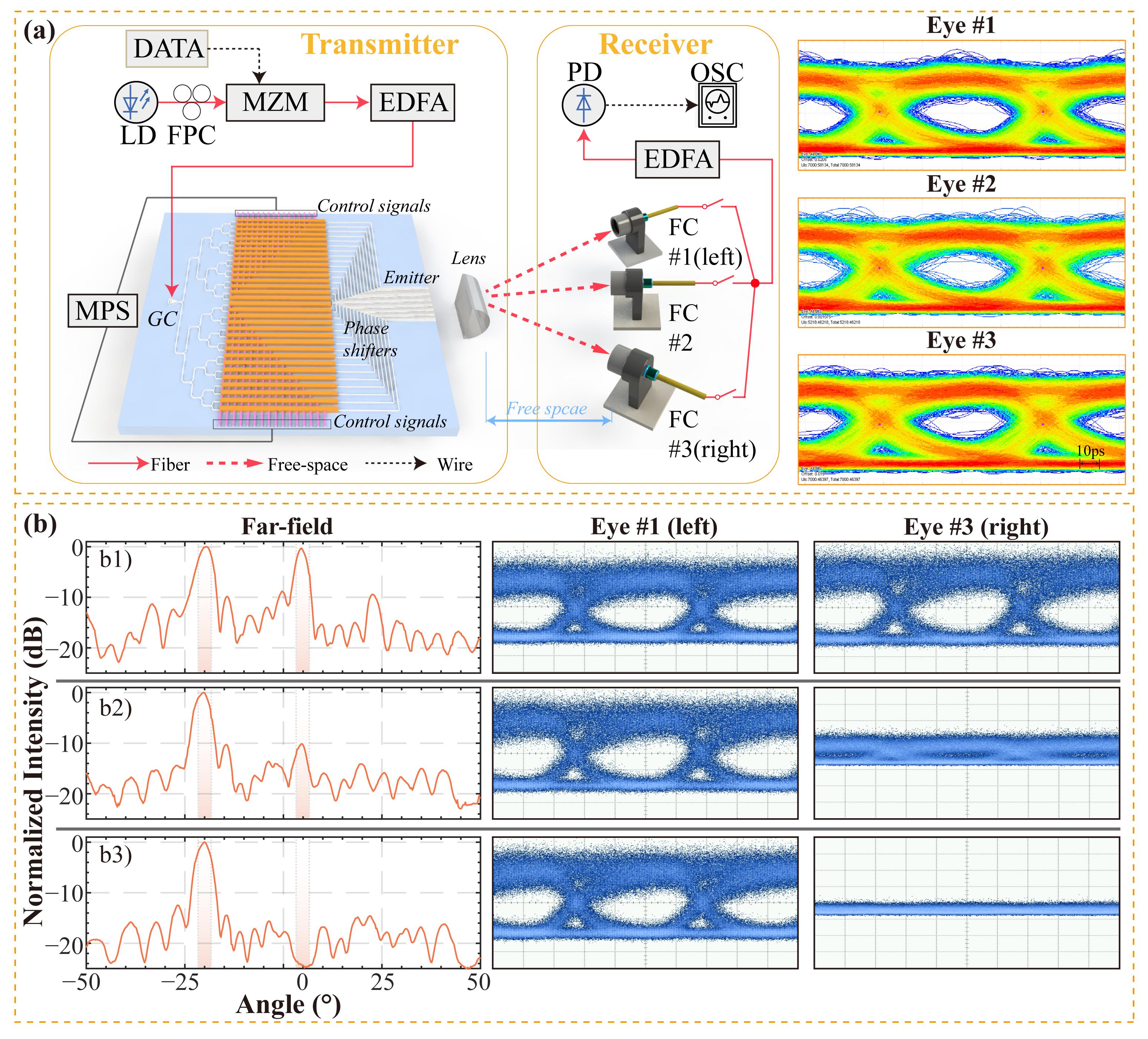 图3. 普通/隐私保护下的无线光通信:(a) 多用户无线光通信实验设置与12Gbps接收眼图;(b) 基于双波束用于隐私通信的定向抑制。右用户接收光强为0dB(b1 双波束)、−10dB(b2 单波束)、−25dB(b3 单波束附带定向抑制),对应右用户眼图为完全张开(误码率<10−12),部分压缩(误码率≈10-2),以及完全闭合(误码率太高,无法测量)。