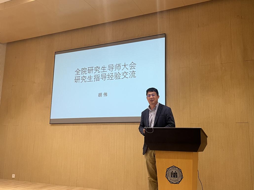 会议邀请优秀导师代表胡伟教授发言,胡老师根据自己与研究生实际相处的一些事例,分享了自己在营造和谐团结的课题组氛围上进行的一些思考和尝试。