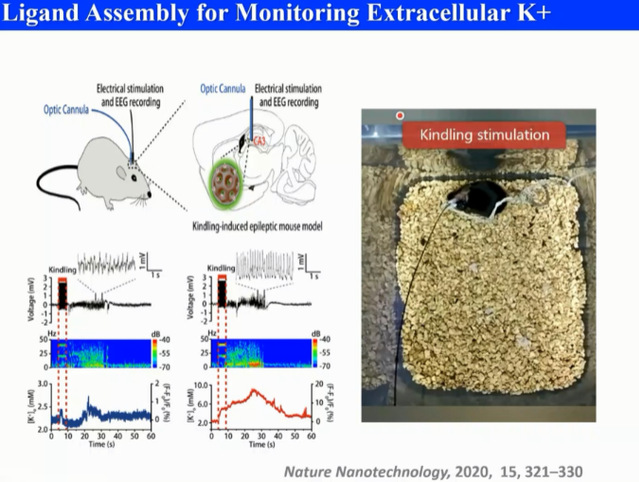 以神经退行性疾病为例,这类疾病由于神经元功能性的紊乱,即膜电位发生紊乱,会对人体造成严重的后果。膜电位的变化归因于离子的传输问题,如果可以在上游确定膜电位的变化,就可以提前预测疾病的发生。但是由于目前没有探针可以灵敏地、选择性地区分离子,所以这种想法难以实现。凌教授课题组将已有的探针包覆在介孔硅中,再在介孔硅表面自组装一层配体,而去识别不同的离子;并在此基础上,对老鼠癫痫发作状态下不同部位的电位变化做了监控和评估,为未来预测疾病提供了可行性。
