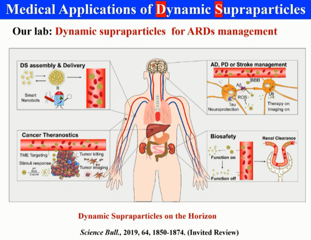 近年来,化学自组装进入了人们的视线,可逆的组装解聚的过程成为了最主要的问题,也为解决上述问题提供了思路,实现了在疾病部位的灵活调控。例如在癌症治疗方面,合成的自组装体到达肿瘤部位实现诊断或者治疗功能之后,能够自动响应肿瘤微环境实现解体,成为可以肾清除的小颗粒。为此,凌教授举一反三,根据不同疾病下的不同生理微环境条件进一步的提出了相应的治疗方式,将这种理念扩展到神经退行性疾病、细菌感染、伤口愈合干细胞治疗等领域。
