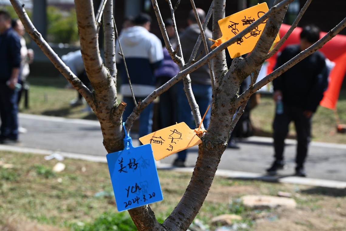 本次植树活动所用的树种为晚樱,数量为20棵。后勤党员发挥专业特长,为大家详细讲解种树的工序,亲身示教,同学们领悟要领后就戴上手套,撸起袖子,扛起铁锹,提起水桶,全身心地投入到了如火如荼的劳动中去。大家兴致高昂,每三至五人搭配成组,合理分工,劳动效率很高。最后,同志们把名牌挂在了新植树苗的枝桠上,既是劳动的纪念,也是成就的证明。