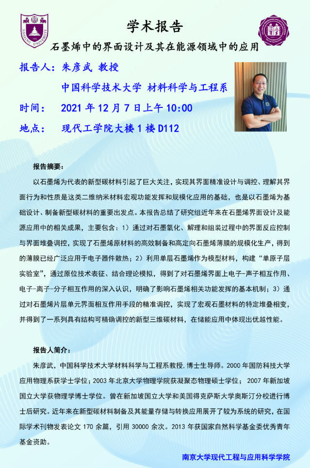 12月7日星期二中国科学技术大学朱彦武教授学术报告