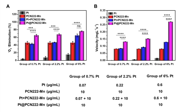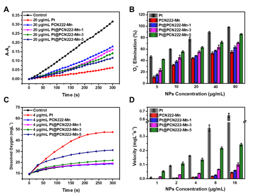 通过对类SOD、类CAT的活性测试(图2),证明了级联纳米酶Pt@PCN222-Mn不仅具有良好的ROS清除能力,而且可以通过改变纳米颗粒Pt的含量对其活性进行调控(Pt@PCN222-Mn-1、Pt@PCN222-Mn-3和Pt@PCN222-Mn-5为通过改变Pt NPs的用量合成的三种不同含量Pt NPs的MOF级联纳米酶)。