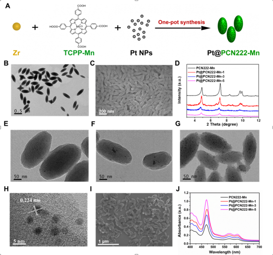 本研究通过将具有类SOD活性的锰卟啉结构和类CAT活性的铂纳米粒子(Pt NPs)引入由锆氧簇和卟啉通过自组装而形成的金属有机框架化合物PCN222中,成功合成了一种能够清除ROS的集成化级联纳米酶(Pt@PCN222-Mn)(图1)。该级联纳米酶具有两种相互分离的催化活性位点,它们可以分别模拟SOD和类CAT的催化活性。这种基于MOF结构的级联纳米酶同时具有限域效应和中空结构,不仅可以实现高效地协同催化,还有利于提高底物的传质效率。