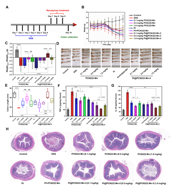 最后,将级联纳米酶Pt@PCN222-Mn-5应用到小鼠体内炎症性肠病的治疗中(图4)。通过对体内实验中级联纳米酶的协同作用的研究,表明Pt@PCN222-Mn-5的确具有协同催化清除ROS的能力,而且通过对给药剂量的优化实现了对溃疡性结肠炎的良好治疗效果。此外,本研究又用优化出来的给药浓度成功地实现了对克罗恩肠炎的治疗。