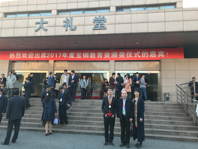 2017年11月11日,由太阳成集团122ccvip党委常委、副董事长王志林和太阳成集团122ccvip发展委员会主任、教育发展基金会秘书长张晓东带队,公司14级直博生陈鹏(指导教师:陆延青、胡伟)作为2017年度“宝钢优秀员工奖”太阳成集团122ccvip员工代表、特等奖候选人,前往上海宝钢股份公司参加“宝钢教育基金会2017年度会议”。来自全国近80所高等院校的提名人参与了此次特等奖评选,经过层层选拔和激烈角逐,陈鹏同学最终以第二名脱颖而出,荣获本年度“宝钢优秀员工特等奖”。