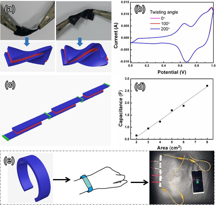 图2.(a)器件扭曲实物和示意图;(b)不同扭曲角度下器件的CV曲线;(c)器件串联示意图;(d)器件电容随面积的变化;(e)将器件串联制成手环电容器为智能手机充电。