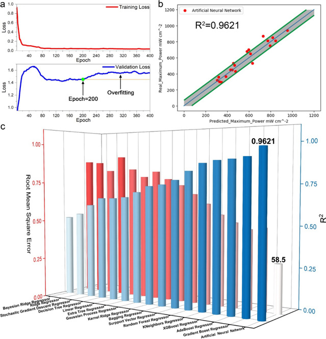 a) 人工神经网络的训练误差与验证误差曲线;b)人工神经网络在测试集上预测最大功率密度的准确度表现;c)16种机器学习算法在网格搜索优化最佳超参数组合后在预测最大功率密度时的性能表现对比