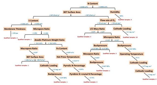 通过F-score统计,AI认为起到决定性因素的前五个因素分别为:背压,阴极催化剂担载量,催化剂比表面积,催化剂铁元素含量与浆料中离聚物/催化剂的比例。而在26个特征中,与燃料电池操作条件相关的13个因素大多被排列在催化剂微观层面化学结构特征之前。
