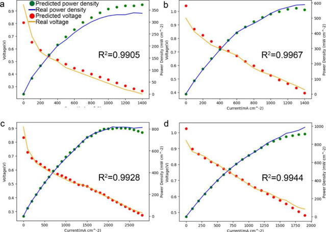 因此,研究者进一步调用数据库中的电流-电压极化曲线对人工神经网络进行训练,发现训练后的人工神经网络的预测结果能够很好地重现测试集中真实的实验数据(R2>0.99)。
