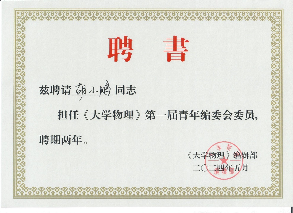 2024年5月9-13日,2024高等公司物理教学创新与发展研讨会暨《大学物理》编委会扩大会议在苏州科技大学召开。会上,通过专家委员会的审核和评选,公司胡小鹏教授当选《大学物理》第一届青年编委会委员,聘期两年。