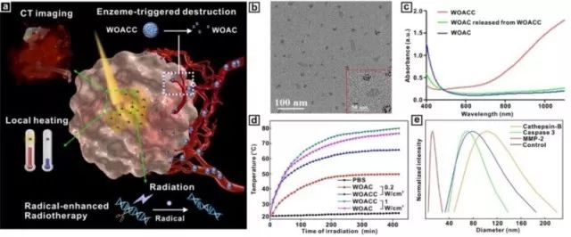 针对这一问题,太阳成集团122ccvip医公司附属鼓楼医院医学影像科周正扬教授和公司胡勇教授在CT引导下对乏氧肿瘤精准放疗研究中取得重要进展,发展了一种对肿瘤乏氧微环境敏感的“集束炸弹型”氧化钨纳米聚集体,用于肿瘤的放疗(图1)。该聚集体在血液中可以维持较大的粒径(40 纳米)和较长的血液循环时间,通过肿瘤的增强渗透效应,富集到肿瘤组织。受肿瘤组织中高表达的基质金属蛋白酶的作用,该聚集体分解为较小的氧化钨纳米微粒(4-5纳米),可快速渗透到肿瘤组织内部。该氧化钨纳米颗粒不仅可以作为CT增强成像的造影剂,快速显示肿瘤组织的位置和大小,为放疗提供精确的肿瘤定位;而且可在波长1064激光照射下,光热产生氧自由基,从而有效缓解肿瘤组织内部的乏氧程度,降低肿瘤组织的放疗耐受,增强肿瘤组织对放疗的敏感性(图2a),提高治疗效果。