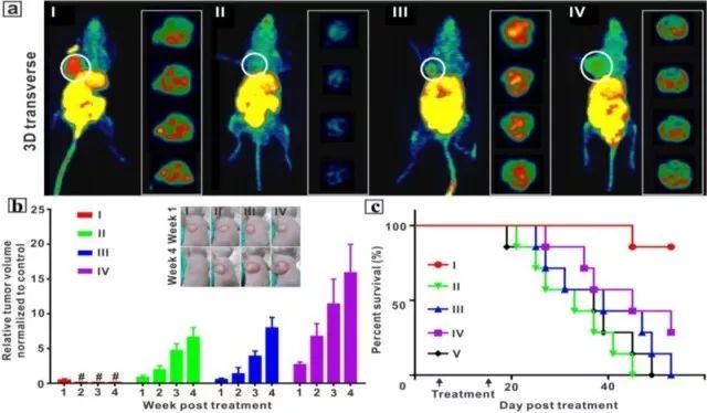 图2. 治疗后乳腺肿瘤中的乏氧程度以及动物生存率变化