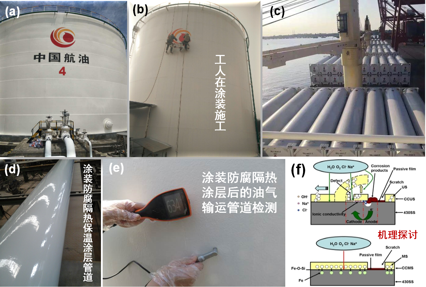 图2.防腐保温节能涂层材料应用于国家海洋工程、涂装施工、性能现场检测及微观机理。