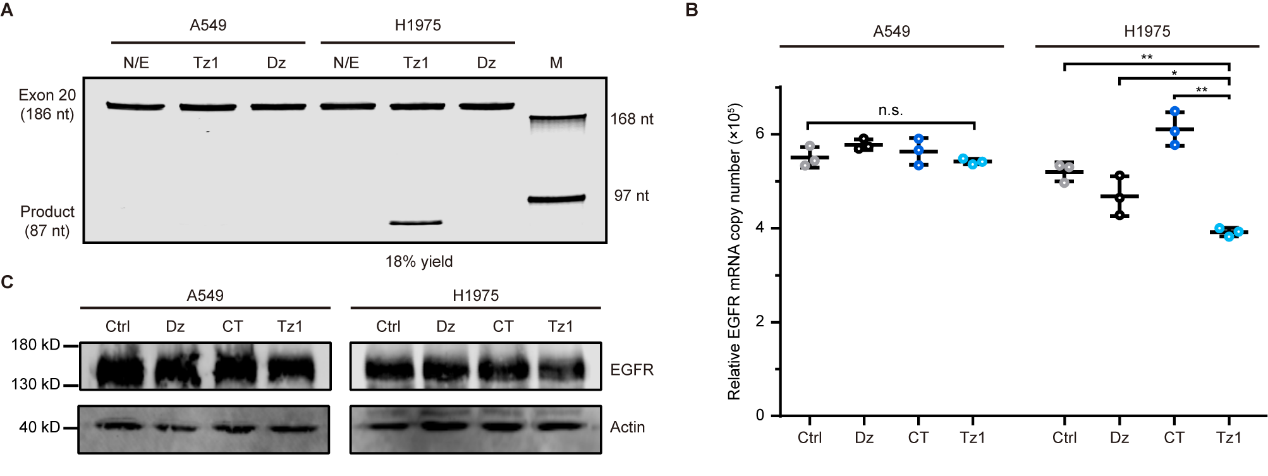 因为RNA是细胞内遗传信息流动的关键一环,因此可作为生物医药领域的重要靶点。作者尝试使用Tz1切割一个EGFR(表皮生长因子受体)突变基因产生的RNA,该突变导致非小细胞肺癌患者对酪氨酸激酶抑制剂类的靶向药产生耐药。作者意外地发现Tz1能区分底物上的单位点突变,即选择性切割发生了突变的基因转录本,而不影响正常的基因转录本(图5)。利用这个性质,作者进一步展示了Tz1可以在细胞内介导高度选择性的基因沉默,为基因治疗提供了新型工具分子(图6)。