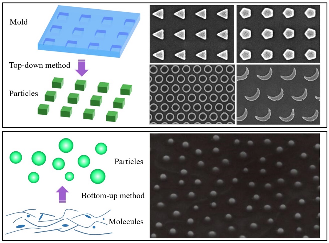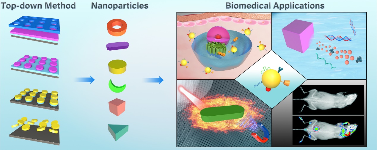 不同于自下而上的方法,以光刻(Photolithography)、纳米压印(Nanoimprint Lithography)为代表的自上而下的方法通过使用精确控制、定义的结构(如:掩模、模具等)或能量形式(如:光、电子束等)来获得形状及尺寸特定且统一的纳米图案。进而利用此纳米图案,结合刻蚀、镀膜等微加工手段制备纳米粒子。从而获得形状特定、尺寸单一、成分可控的纳米粒子,并利用这些因素实现对纳米粒子性能调控,获得生物医学应用所需的特性。
