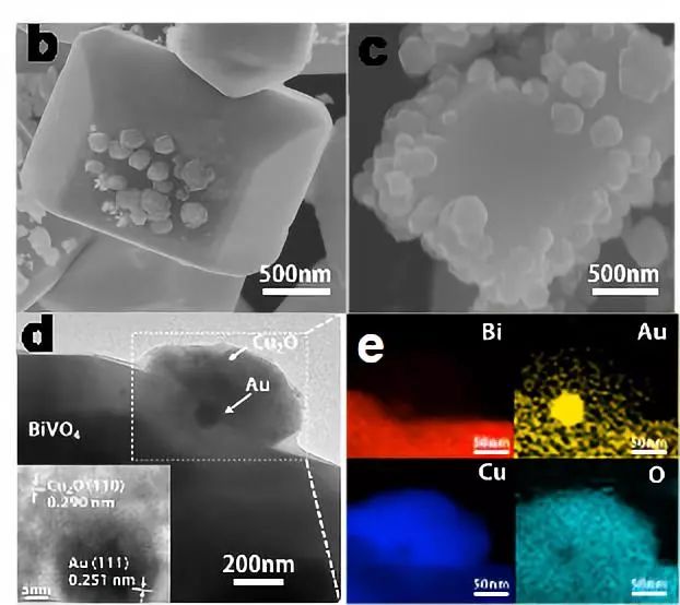 BiVO4{010}-Au-Cu2O 和BiVO4{110}-Au-Cu2O Z型光催化体系(b-e)。