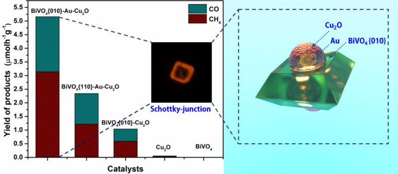 图 3.晶面依赖的BiVO4-Au-Cu2O Z体系光催化材料催化CO2还原到CH4的性能和性能差异起源。