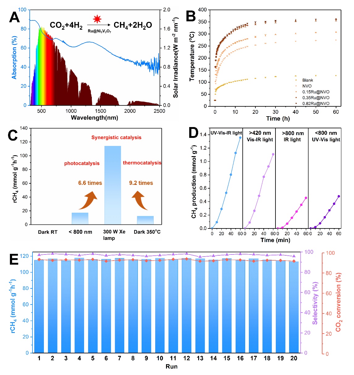 图1.(A)0.35%Ru@Ni2V2O7样品的紫外-可见-红外吸收光谱和AM 1.5 G的光谱;(B)不同Ru负载量的Ni2V2O7样品在300 W 氙灯(~2.0 W cm-2)照射下的温度随时间的变化曲线;(C)室温黑暗下、λ< 800 nm照射下、300 W 氙灯照射下、350 oC避光条件下,0.35Ru@ Ni2V2O7样品的CH4平均生成速率;(D)在300 W 氙灯加不同滤光片的照射下,0.35Ru@ Ni2V2O7的CH4生成速率随时间的变化曲线。 通过调节灯的输入电流,将不同滤光片的光强固定在~ 4.5个标准太阳;(E)0.35Ru@Ni2V2O7样品的20次循环稳定性测试。