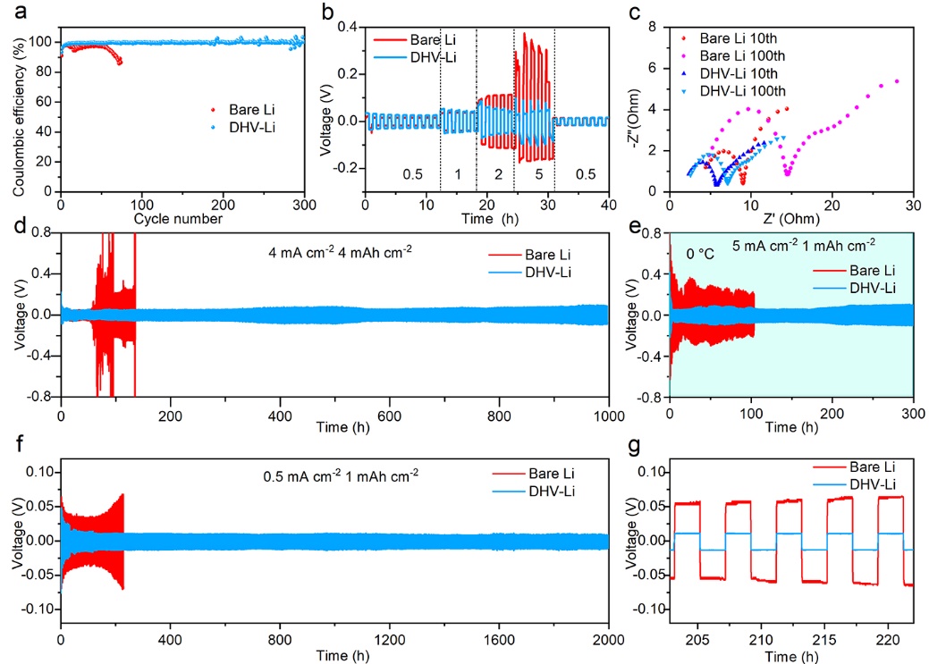 图 3. 裸锂和 DHV-Li 电极的电化学特性。(a) 在 0.5 mA cm-2和 1 mAh cm-2的不同电解液中充放电过程中锂的库伦效率,通过充电至 1.0 V vs Li+/Li 的截止电压来电沉积锂;(b) 在 0.5 到 5 mA cm-2的不同电流密度下的倍率性能;(c) EIS图谱;(d) 4 mA cm-2 和4 mAh cm-2;(e) 0 °C 5 mA cm-2和1 mAh cm-2和 (f, g) 0.5 mA cm-2和 1 mAh cm−2处的时间-电压曲线