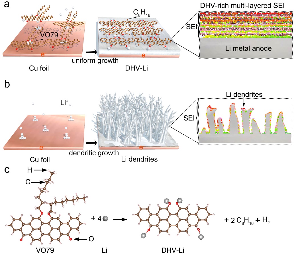 图 1. 锂沉积过程和 SEI膜形成示意图:(a) PAHs 和混合 SEI膜的形成过程示意图;(b)空白组,锂金属在铜箔上枝晶生长的示意图;(c) VO79和Li反应机理